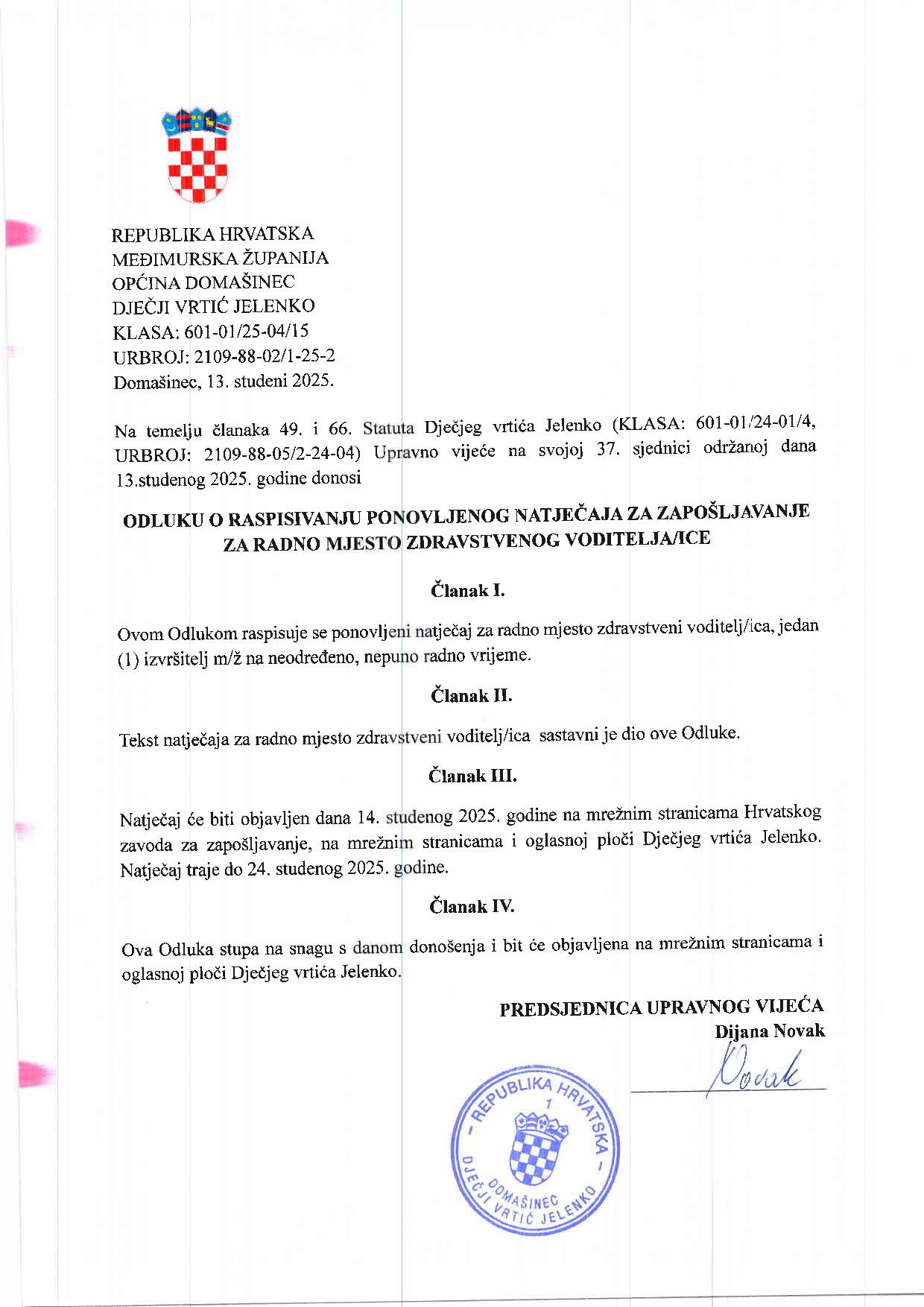 Odluka i natječaj za radno mjesto zdrastveni voditelj/ica 11/2025
