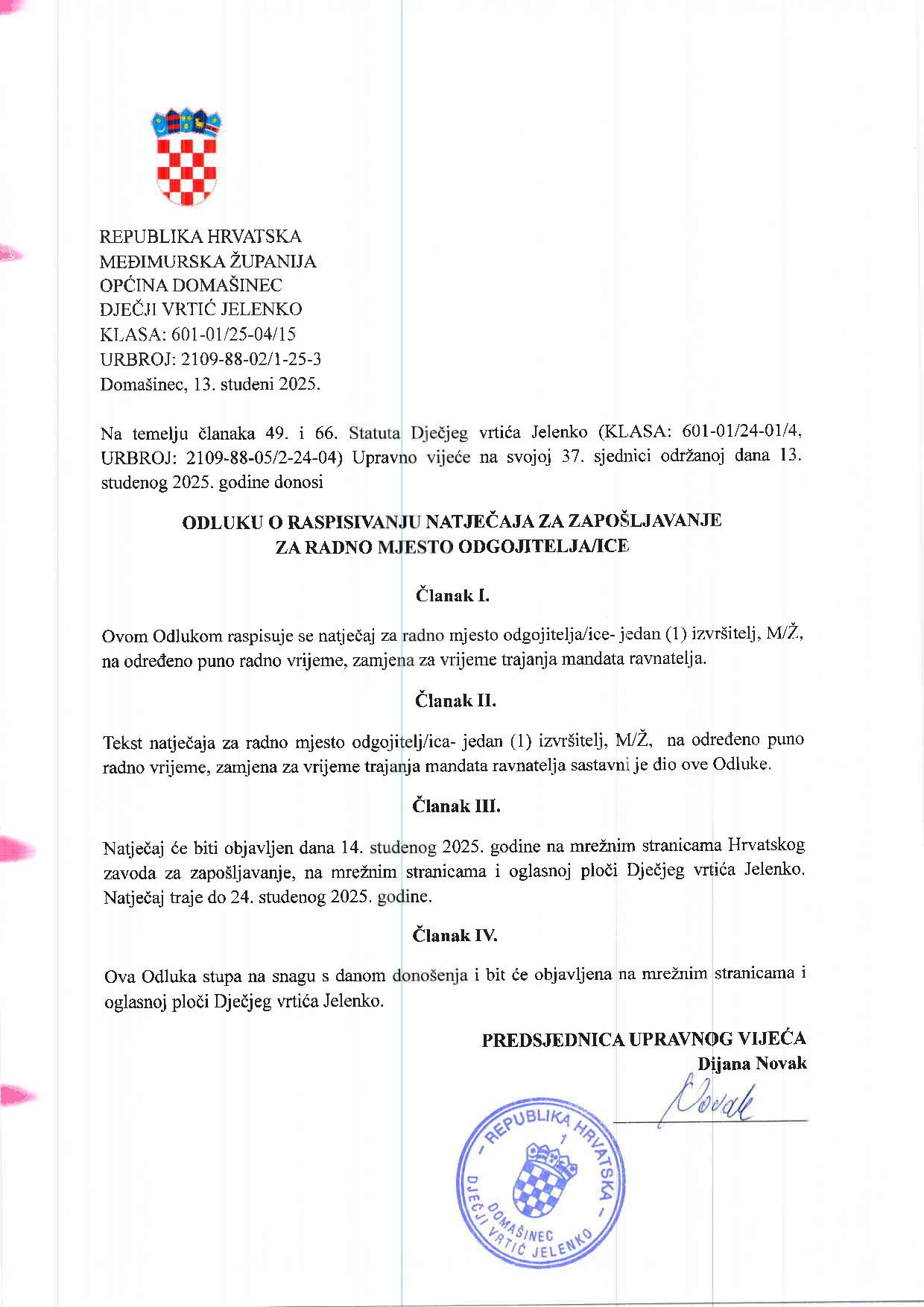 Natječaj i odluka o raspisivanju natječaja za zapošljavanje za radno mjesto odgojitelja/ice 11/2025