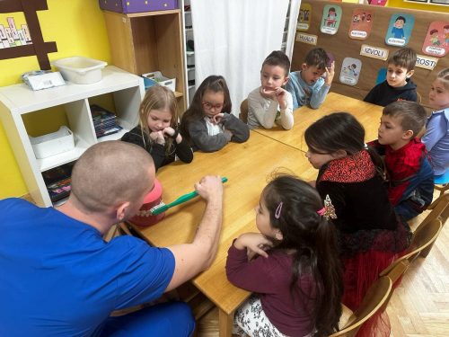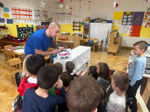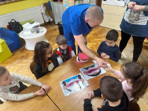 Odgovor na ovo pitanje djeci je na njima primjeren način dao omiljeni striček u našem vrtiću, zdravstveni voditelj Nikola. Zdravstveni voditelj je održao radionice gdje su djeca učila o tome kako pravilno peremo zube, što nam je sve potrebno za pranje zubi, koja količina paste je dovoljna, koliko dugo peremo zube.