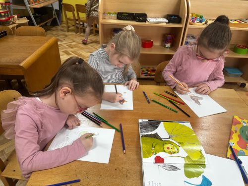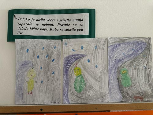 Sovići su čitali, analizirali te naposljetku radili i aktivnosti vezane uz ovu slikovnicu. Slikovnica ima predivne ilustracije te su se u crtanju tih ilustracija okušali i Sovići. Na panou su istaknuti radovi Sovića koji prate radnju Bube. Također, istraživali su i životni ciklus leptira te su napravili plakat na tu temu. Istraživali smo kakvi sve leptiri postoje, gledali razne videoisječke, uočavali smo boje i posebnosti te životinjske vrste. Pročitali smo i slikovnicu Vrlo gladna gusjenica te ju usporedili sa slikovnicom Buba. Osim što smo naučili ponešto o životinjskom svijetu, dotaknuli smo se i teme sazrijevanja odnosno odrastanja. Sovići su zamišljali i opisivali svoj budući život, čime će se baviti te su tom prilikom crtali kako zamišljaju sebe tijekom desetak godina. Tako smo se dotaknuli i teme prolaznosti vremena. U sobi dnevnog boravka na ploči smo napravili ciklus nastajanja leptira. Za kraj tjedna Sovići su posadili lavandu kako bi na njihovu terasu sletjelo što više šarenih leptirića.